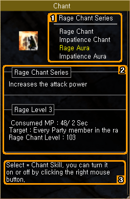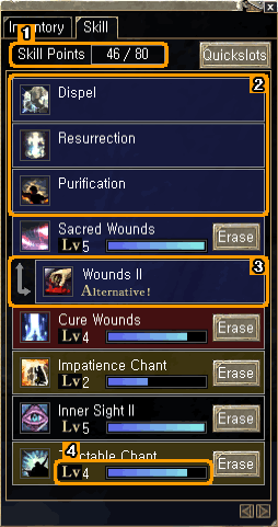 Shows all 4 levels of the skill series and highlights the current level with yellow color.
